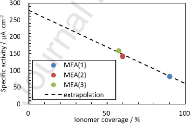如果聚合物覆蓋率為??的Pt催化劑比活性SA可假定為聚合物覆蓋和未覆蓋區(qū)域比活性的線性加權平均值,則應表示為:SAave(??)=??×SAion+(1-??)×SAbare。SAion和SAbare分別為聚合物覆蓋和未覆蓋Pt催化劑的比活性。從上述公示可以看出,可通過擬合直線估算出SAion和SAbare,即SAion=61 μC·cm-2和SAbare=278 μC·cm-2。