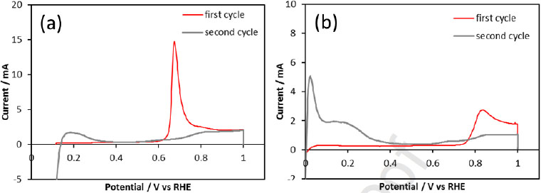 上圖分別顯示了根據(jù)CO消除電荷估算的在電位掃描期間MEA(2)和MEA(3)的ECSA,計算方法與MEA(1)相同。MEA(2)的兩個樣本ECSA分別為53%和67%,而MEA(3)分別為57%和58%。對于非多孔碳載體MEA(1),幾乎所有的Pt納米顆粒都位于碳載體外表面上,并傾向于被聚合物覆蓋。相反,對于多孔碳載體MEA(2)和MEA(3),有更多的Pt納米顆粒位于碳載體內(nèi)表面和未被聚合物覆蓋的區(qū)域。