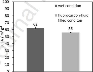 濕操作和碳氟化合物流體填充條件下從CO氧化電流估算得出的MEA(2,a)和MEA(3,b)的ECSA(兩樣本平均值)