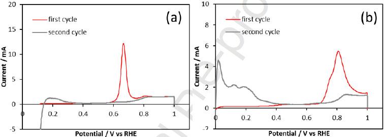 CO消除實驗的具體流程如下:首先以0.05 V/s的掃描速率在0.115~1.0 V電壓循環(huán)區(qū)間清潔(clean)陰極;電壓循環(huán)后,使用5%CO含量的N2對電池陰極吹掃20分鐘;然后在維持恒電位0.08 V的同時,用N2吹掃陰極1分鐘;吹掃后,以0.02 V/s的電壓掃描速率升壓至1.0 V并在1.0 V下維持2分鐘,以氧化剝離吸附在Pt催化劑表面上對電化學反應有影響的所有CO分子,該掃掠模式連續(xù)施加兩次;通過在第一次和第二次掃描間的雙電層電位區(qū)域上(0.4-0.6 V)的電荷差來獲得CO消除電荷(charge)(假設比電荷為420 μC·cm-2,通過CO消除電荷來估算ECSA。
