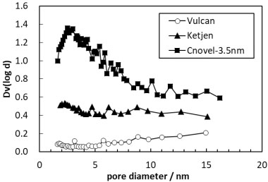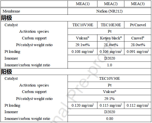 本次研究總共制備三種碳載體型膜電極,一種為非多孔碳載體,另外兩種為多孔碳載體。針對每種碳載體型膜電極,分別制備2片膜電極。下表為此次研究中膜電極的具體信息。作為商用非多孔碳載體和多孔碳載體催化劑,TEC10V30E (Pt/Vulcan)和TEC10E30E (Pt/Ketjen)都采購自田中貴金屬。此外,另一種Cnovel多孔碳載體催化劑為自制,其中Cnovel碳載體采購自東陽炭素。為降低進入內(nèi)部孔隙的阻力,將Cnonel碳載體在500℃空氣中進行預處理以氧化去除少量碳碎片。Vulcan、Ketjen和Cnovel三種碳載體的孔徑分布如下圖所示。
