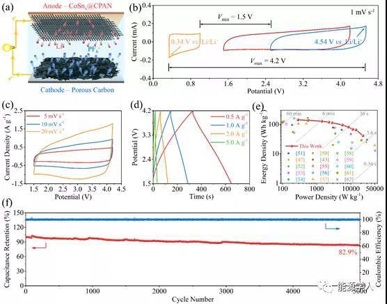 圖5和圖6分別是CoSnx@CPAN的半電池性能和全電池性能的結(jié)果。CoSnx @ CPAN可用作鋰離子電容器的負極,其展現(xiàn)出的Li+存儲容量高達657.7 mAh g-1,超出了許多基于Sn的合金型負極材料,以及石墨和氧化物類型的嵌入式負極材料。其優(yōu)秀的容量和倍率性能源自贗電容型的動力學特征,例如圖5c中,通過CV峰計算得到動力學特征值接近1.0。和活性炭進行全電池組裝后,鋰離子電容器可在1.5-4.2 V的電位區(qū)間工作,能量密度高達143Wh kg-1,功率密度可以達到22.8kWkg-1。該結(jié)果證明基于CoSnx@CPAN的鋰離子電容器在數(shù)秒到數(shù)十分鐘的充放電區(qū)間內(nèi),均擁有優(yōu)異的電化學儲能性能。此外,本文報道的半電池和全電池均擁有良好的循環(huán)穩(wěn)定性。