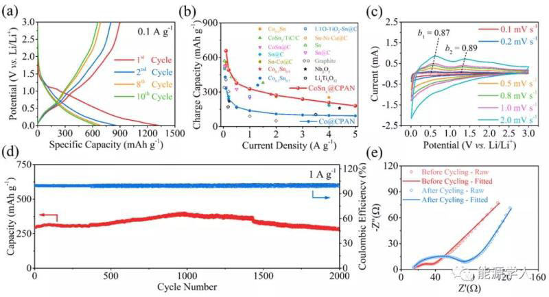 圖5. CoSnx@CPAN的半電池性能。(a) 初始充放電曲線; (b) 倍率性能結(jié)果; (c) 不同電壓掃描速率下的CV曲線。虛線標記了峰值電流的位置,用于動力學特征值b值的計算; (d) 循環(huán)穩(wěn)定性和庫侖效率; (e) 循環(huán)穩(wěn)定性測試前后的EIS圖譜。