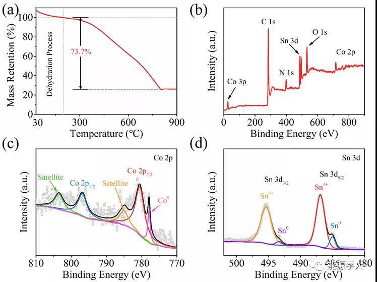 圖4. CoSnx@ CPAN的表征。(a) TGA; (b) XPS; (c) Co 2p和 (d) Sn 3d的XPS軌道光譜.