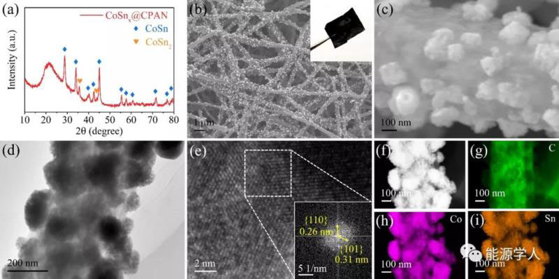 圖3. CoSnx@CPAN納米纖維的組分和形態(tài)表征。(a) XRD光譜; (b) 低倍SEM圖像。插圖是高溫煅燒后的光學照片; (c) 高倍SEM圖像; (d) TEM圖像; (e) HRTEM圖像, 插圖是所選區(qū)域的FFT圖像; (f) STEM圖片; (g)C,(h) Co和 (i) Sn元素的EDS面掃結(jié)果。