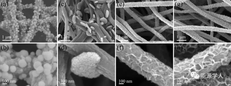 圖2. 陰離子交換過程后復合納米纖維的SEM圖像。ZIF-67@PAN浸入以下水溶液: (a-b) Na2SnO3;(c-d) NH4VO3; (e-f) Na2MoO4; (g-h)Na2WO4.
