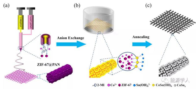 圖1. 復合納米纖維膜的合成方案。(a)同軸靜電紡絲制備ZIF-67@PAN納米纖維膜; (b)陰離子交換過程; (c)高溫煅燒進一步制備得到樣品。
