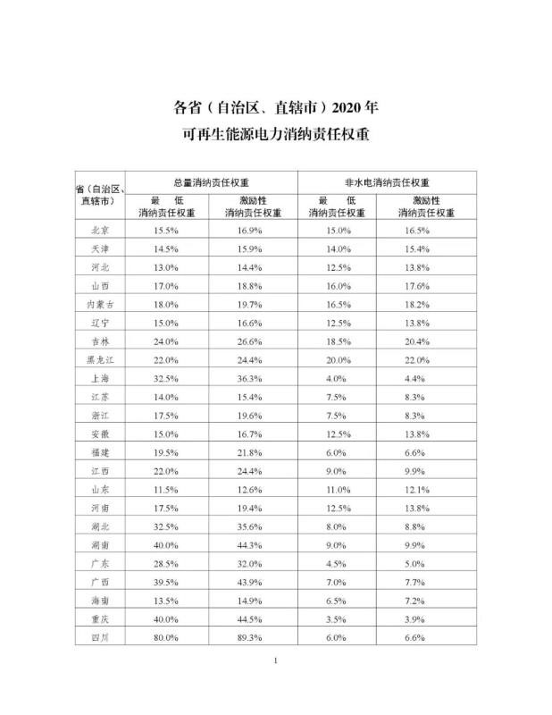 根據(jù)《國家發(fā)展改革委 國家能源局關(guān)于建立健全可再生能源電力消納保障機(jī)制的通知》(發(fā)改能源〔2019〕807號(hào)),在各地測(cè)算的基礎(chǔ)上,我們統(tǒng)籌提出了各省級(jí)行政區(qū)域2020年可再生能源電力消納責(zé)任權(quán)重,現(xiàn)印發(fā)你們,請(qǐng)認(rèn)真組織落實(shí)。