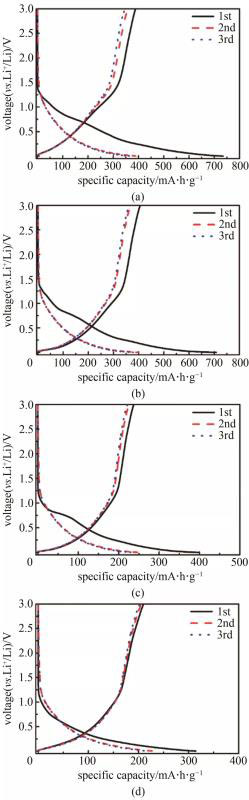 圖6 菱角殼基硬炭電極在0.1 C電流密度的充放電曲線:(a) HT-900; (b) HT-1100; (c) HT-1300; (d) HT-1500