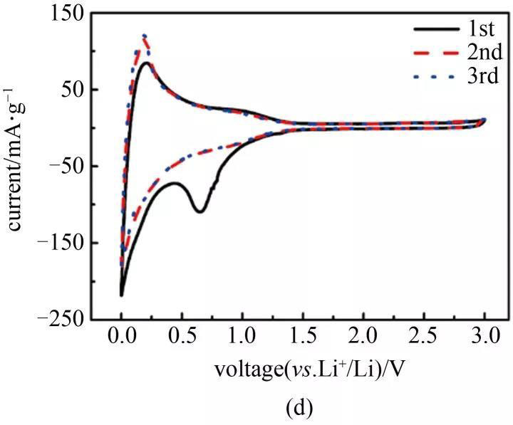 (2)在鋰離子電池中,HT-1100電極以0.1 C電流密度充放電的可逆比容量為405.6 mA·h/g,首次庫侖效率為57.32%,并且具有優(yōu)異的循環(huán)性能。