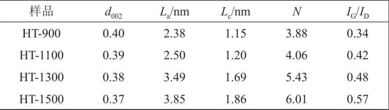 圖2菱角殼基硬炭的XRD與Raman譜圖。由圖2(a)可知,HT-x樣品分別在23°和43°出現(xiàn)較寬的(002)和(10)衍射峰,說明HT-x具有無序結構。根據(jù)(002)衍射峰和(10)衍射峰的位置、布拉格方程和謝樂公式,計算出石墨微晶的結構參數(shù)d002、La、Lc、N值,如表1所示。隨著炭化溫度的升高,(002)衍射峰逐漸逐漸尖銳并向又偏移,樣品的d002值由0.40 nm減小至0.37 nm,但均大于石墨的層間距(0.335 nm),La和Lc明顯增大,N值也逐漸增大(從3.88 增加至6.01),表明較高溫度炭化的樣品,石墨化程度也高。由圖2(b)所示,拉曼光譜在1350 cm-1(D峰)和1580 cm-1(G峰)處出現(xiàn)兩個特征峰,說明HT-x具有無定形炭結構。IG/ID值由0.34 nm增大至0.57 nm,且特征峰隨炭化溫度升高逐漸尖銳,表明HT-x樣品的石墨化程度隨溫度升高而升高,與XRD和TEM的討論結果一致。
