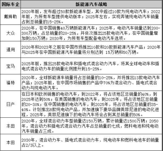事實(shí)上,包括戴姆勒、大眾、寶馬、通用、福特、豐田等幾乎所有的國(guó)際車企均給出了明確的電動(dòng)化信號(hào),并制定了清晰的戰(zhàn)略目標(biāo)。對(duì)于動(dòng)力電池的需求自然水漲船高。