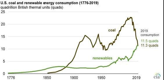 圖一:美國(guó)1776-2019年煤炭及可再生能源消耗量