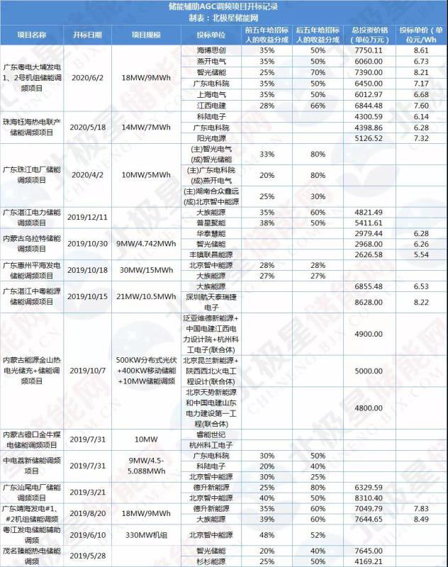 2019年儲能調(diào)頻是最熱門的應(yīng)用領(lǐng)域,上半年曾密集發(fā)布了多個項目招標(biāo);2020年近半年來僅有4個儲能調(diào)頻項目發(fā)布了招標(biāo)、中標(biāo)消息。據(jù)北極星儲能網(wǎng)不完全統(tǒng)計,2019年以來儲能調(diào)頻報價并沒有太大降幅,投標(biāo)單價基本維持在6~8元/Wh。2019年曾有一家企業(yè)在內(nèi)蒙古烏拉特儲能調(diào)頻項目中以5.54元/Wh打破行業(yè)最低報價記錄,不過直到目前2020年最低單價報價記錄為珠海鈺海熱電聯(lián)產(chǎn)儲能調(diào)頻項目中科陸電子的6.14元/Wh。此次開標(biāo)的大埔發(fā)電儲能調(diào)頻項目中,海博思創(chuàng)和智光電氣的投標(biāo)單價超過了8元/Wh。詳細(xì)如下: