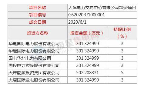 天津電力交易中心增資項(xiàng)目已完成!日前北京產(chǎn)權(quán)交易所公布天津電力交易中心有限公司增資項(xiàng)目結(jié)果,結(jié)果顯示,天津電力交易中心新引入6家投資方,分別為華電國(guó)際電力股份有限公司、國(guó)電華北電力有限公司、國(guó)投電力控股股份有限公司、天津能源投資集團(tuán)有限公司、大唐國(guó)際發(fā)電股份有限公司。持股比例均在3%-5%之間。