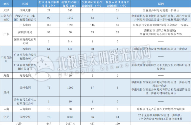 近日,國家可再生能源信息管理中心發(fā)布可再生能源電價附加補貼清單申報項目復(fù)核工作開展情況,截止6月4日,天津、內(nèi)蒙古自治區(qū)、廣東、廣西自治區(qū)、海南、貴州、云南、寧夏8地的可再生能源電價附加補貼清單申報項目復(fù)核工作中,共涉及647個可再生能源項目,其中初審?fù)ㄟ^的光伏項目總規(guī)模達9457.4MW。經(jīng)統(tǒng)計,共457個可再生能源項目通過復(fù)核,復(fù)核未通過的有190個。其中廣西新電力投資集團有限公司經(jīng)營區(qū)域未通過復(fù)核的可再生能源項目最多,為76個。復(fù)核未通過原因多為全容量并網(wǎng)時間需進一步確認、不符合申報條件等因素。