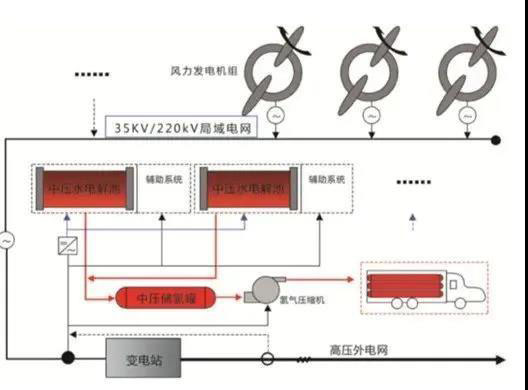 風(fēng)電制氫技術(shù)是將風(fēng)能通過風(fēng)力發(fā)電機(jī)轉(zhuǎn)化成電能,電能通過電解水制氫設(shè)備轉(zhuǎn)化成氫氣,通過將氫氣輸送至氫氣應(yīng)用終端,完成從風(fēng)能到氫能的轉(zhuǎn)化。根據(jù)風(fēng)電來源的不同,可以將風(fēng)電制氫技術(shù)分為并網(wǎng)型風(fēng)電制氫和離網(wǎng)型風(fēng)電制氫兩種。并網(wǎng)型風(fēng)電制氫是將風(fēng)電機(jī)組接入電網(wǎng),從電網(wǎng)取電的制氫方式,比如從風(fēng)場的35kV或220kV電網(wǎng)側(cè)取電,進(jìn)行電解水制氫,主要應(yīng)用于大規(guī)模風(fēng)電場的棄風(fēng)消納和儲(chǔ)能。離網(wǎng)型風(fēng)電制氫是將單臺(tái)風(fēng)機(jī)或多臺(tái)風(fēng)機(jī)所發(fā)的電能,不經(jīng)過電網(wǎng)直接提供給電解水制氫設(shè)備進(jìn)行制氫,主要應(yīng)用于分布式制氫或局部應(yīng)用于燃料電池發(fā)電供能。