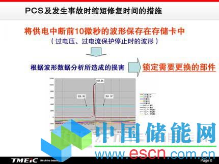 PCS配備了過電壓、過電流保護(hù)裝置,會斷開直流電路來防止雷擊導(dǎo)致事故擴大,但重要的是,發(fā)生故障后如何盡快修復(fù),從而使發(fā)電損失降至最低。TMEIC通過將保護(hù)裝置啟動10μs之前的電壓及電流波形保存在存儲卡內(nèi),來掌握入侵的浪涌能量,并在短時間內(nèi)鎖定發(fā)生故障的部件,由此縮短了修復(fù)時間(圖)。
