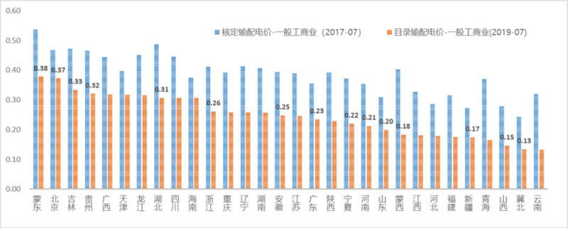 以不滿1千伏的一般工商業(yè)用戶為例,下圖統(tǒng)計了在2017年通過首輪輸配電價改革核定的2017-2019年輸配電價水平,和經(jīng)兩年降價政策調(diào)整后的2019年7月公布的輸配電價水平。除上海和甘肅外(也不含西藏),這兩個價格都是隨目錄電價文件一起下發(fā),具有較強可比性。