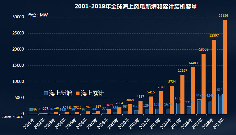 2001-2019年全球海上風(fēng)電新增和累計(jì)裝機(jī)容量(來源:CWEA)