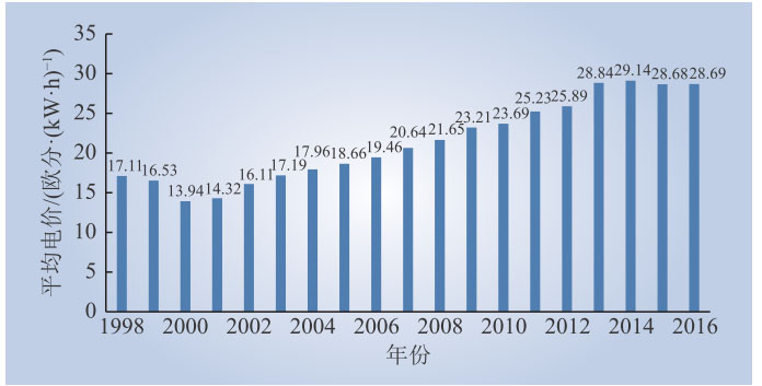 從對電價的影響來看,過去十年中,由于可再生能源分攤費快速增長,德國居民電價持續(xù)走高。德國居民在享受高可再生能源的同時,還承受著高額的國內(nèi)用電電價(2019年為30.43歐分/kW·h,較2000年最低的13.94歐分/kW·h上漲了1.1倍,如圖6所示)。