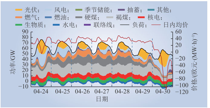 從實際運行來看,新能源按照0電價參與電力市場競價(實際結算電價還包括政府補貼),以保障優(yōu)先上網(wǎng)。當新能源出力高時,電力市場的出清電價下降,甚至出現(xiàn)負電價,受電價影響,火電、燃油燃氣發(fā)電等盡可能降低出力,國外電力市場同樣從德國買入電力;當新能源出力低時,電力市場出清價大幅上漲,刺激各類靈活電源包括國外電源提高發(fā)出電力。