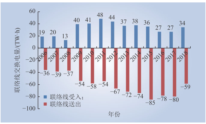 從聯(lián)絡線送受電量來看,由于德國新能源裝機容量較大,風、光出力波動明顯,除了依靠本國硬煤發(fā)電、燃氣發(fā)電調(diào)節(jié)外,還依靠跨國聯(lián)絡線開展電力平衡,利用他國資源平衡本國風光波動。當本國來風、來光較小時,本國電源不能及時開機以保證供電,市場出清價格較高,從國外購入電力;當本國風電、太陽能發(fā)電出力較大時,市場出清價格較低甚至是負電價,向國外低價售出電力。德國跨國聯(lián)絡線交換電量逐年增加,從2006年的55TW·h上升到2017年的107TW·h,增長將近一倍,2018年有所下降,至93TW·h,如圖4所示。