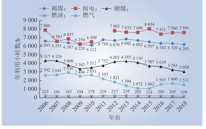 從新能源發(fā)展對常規(guī)電源影響來看,2006—2018年德國燃油發(fā)電主要用途為電網(wǎng)高峰負荷備用、應急備用或距離電網(wǎng)較遠地區(qū)的供電,年平均小時數(shù)比較固定,僅203h。燃氣發(fā)電雖然裝機容量逐漸增加,但由于需要配合風電和光伏發(fā)電開展每日的電力平衡,發(fā)電小時數(shù)逐漸下降,年平均1969h。核電、褐煤發(fā)電也基本不參與電力平衡調(diào)節(jié),僅在市場價格長時間為負電價時采取降出力或關機調(diào)節(jié),核電2006—2018年平均小時數(shù)為7311h(2011年因裝機容量變化較大,未計入),褐煤發(fā)電年平均小時數(shù)為6475h。配合風、光波動開展調(diào)節(jié)的主要是硬煤發(fā)電,導致硬煤發(fā)電小時數(shù)逐漸下降,從2006年的4317h降低到2018年的3050h。