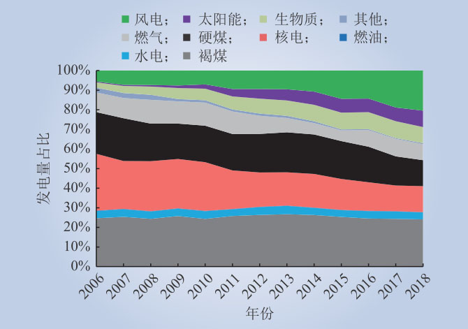 從各類電源年發(fā)電量變化看,褐煤、水電、燃油機組發(fā)電量未有明顯變化;核電受裝機容量減小影響,發(fā)電量減??;風電、太陽能發(fā)電、生物質(zhì)發(fā)電受裝機容量增大影響,發(fā)電量迅速增長;硬煤發(fā)電量逐年減小,但幅度下降不大;燃氣發(fā)電雖然裝機容量增長較快,但發(fā)電量有所降低。各類電源年發(fā)電量占比的變化情況如圖2所示,可以看出,風電、太陽能發(fā)電、生物質(zhì)發(fā)電發(fā)電量占比不斷增加,替代了部分核電、硬煤發(fā)電和燃氣發(fā)電電量。