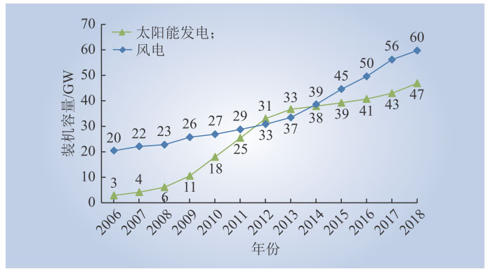 圖1 德國國風電、太陽能發(fā)電裝機容量變化