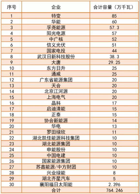 根據(jù)文件,此次符合競爭配置條件的平價光伏發(fā)電項目名單中,共有30家企業(yè)的76個項目7.64GW入圍,其中特變的規(guī)模最大,為850MW;華能次之,為600MW;陽光電源以570MW的規(guī)模,次于孚堯能源573MW,位居第四;中廣核以520MW的規(guī)模位居第五;另外信義光伏、國家電投等企業(yè)也都入圍了不錯的規(guī)模。
