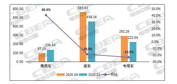 從車輛類型來(lái)看,2020年5月新能源乘用車搭載的動(dòng)力電池裝機(jī)量約2.79GWh,環(huán)比增長(zhǎng)3.3%,占比79.6%,較上個(gè)月提升4.5個(gè)百分點(diǎn);新能源客車搭載的動(dòng)力電池裝機(jī)量約0.47GWh,環(huán)比下降17.9%,占比13.4%,較上個(gè)月下滑2.5個(gè)百分點(diǎn);新能源專用車搭載的動(dòng)力電池裝機(jī)量約0.24GWh,環(huán)比下降24.7%,占比7.0%,較上個(gè)月下滑2個(gè)百分點(diǎn)。