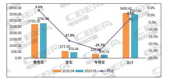 從動(dòng)力電池技術(shù)路線來(lái)看,2020年5月三元電池裝機(jī)量約2.68GWh,環(huán)比增長(zhǎng)1.6%,占比76.3%,較上個(gè)月提升3.1個(gè)百分點(diǎn),其原因是新能源乘用車產(chǎn)量增長(zhǎng)所致;本月磷酸鐵鋰電池裝機(jī)量約0.82GWh,環(huán)比下降14.3%,占比23.3%,較上個(gè)月下滑3.2個(gè)百分點(diǎn),其主要是由于磷酸鐵鋰電池主流配套的新能源客車和新能源專用車產(chǎn)量下滑所致。