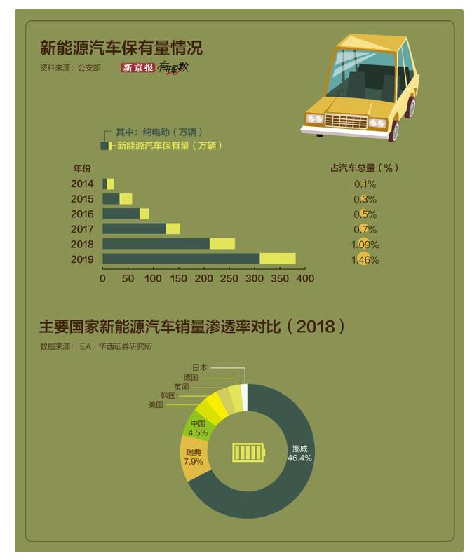 據(jù)公安部統(tǒng)計,截至2019年底,全國新能源汽車保有量達381萬輛,只占汽車總量的1.46%。雖然新能源汽車增量連續(xù)兩年超過百萬輛,但其占汽車整體保有量的比重還是明顯偏低。