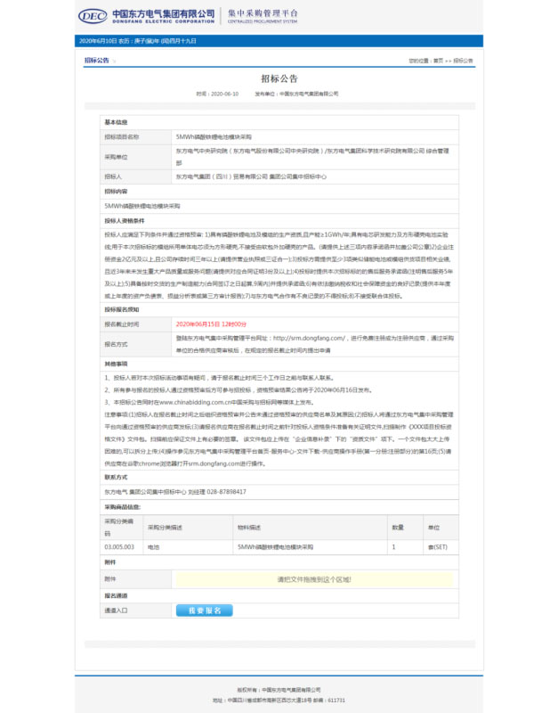 6月10日,東方電氣集團下屬東方電氣中央研究院發(fā)布招標(biāo),擬采購5MWh磷酸鐵鋰電池模塊。