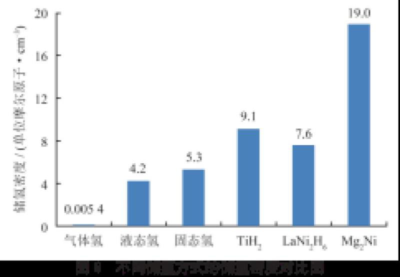 安全、高效的儲運氫技術(shù)是實現(xiàn)氫能實用化的關(guān)鍵[6-7]。氫能的存儲方式主要包括低溫液態(tài)儲氫、高壓氣態(tài)儲氫、固態(tài)儲氫和有機液態(tài)儲氫等,不同的儲氫方式具有不同的儲氫密度,其中氣態(tài)儲氫方式的儲氫密度最小,金屬氫化物儲氫方式的儲氫密度最大(圖 8)。