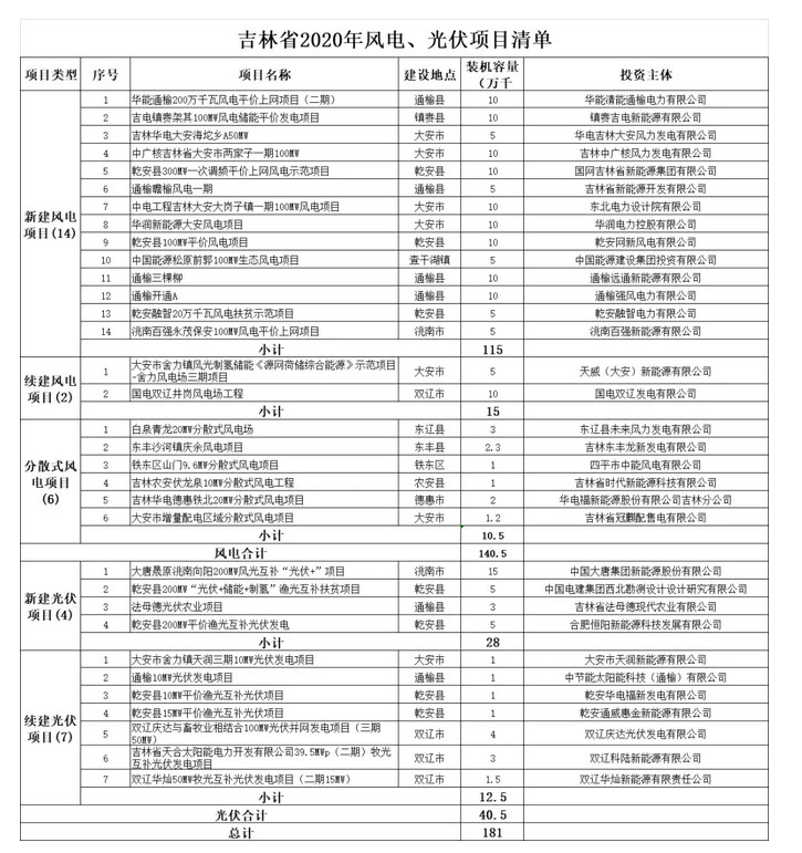 6月15日,吉林省能源局印發(fā)《關(guān)于下達(dá)2020年度風(fēng)電、光伏發(fā)電項(xiàng)目建設(shè)計(jì)劃的通知》,根據(jù)文件,確定本年度新增風(fēng)電、光伏項(xiàng)目建設(shè)規(guī)模為181萬(wàn)千瓦,其中集中式風(fēng)電項(xiàng)目115萬(wàn)千瓦,續(xù)建風(fēng)電項(xiàng)目15萬(wàn)千瓦,分散式風(fēng)電項(xiàng)目10.5萬(wàn)千瓦,集中式光伏項(xiàng)目28萬(wàn)千瓦,續(xù)建光伏項(xiàng)目12.5萬(wàn)千瓦。