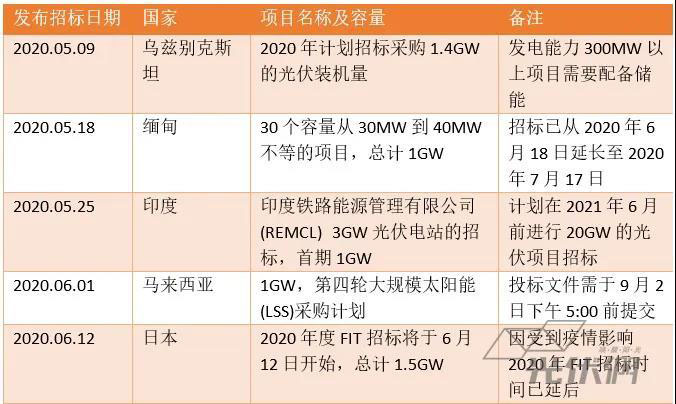 目前,亞太地區(qū)因疫情初期的防疫措施導致的項目延期已經開始有所緩解,緬甸、馬來西亞、烏茲別克斯坦、印度等亞洲國家分別發(fā)布了容量相當大的光伏招標,以此來刺激國內市場的復蘇。詳情如下: