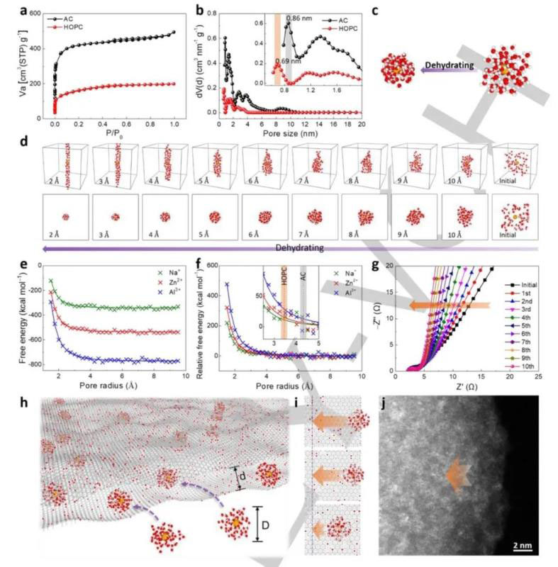 隨后,研究者進行了理論研究。如圖3a所示,氮吸附/解吸曲線表明微孔(<2 nm)和中孔(2-50 nm)同時存在HOPC和AC。近一步的,HOPC和AC的孔徑分布(PSD)通過密度泛函理論(DFT)進行計算。如圖3b所示,HOPC和AC的最小孔的PSD峰分別位于0.69 nm和0.86 nm處,即半徑分別為0.345 nm和0.430 nm。他們推斷,當(dāng)大的離子進入HOPC的最小孔時,它們將經(jīng)歷部分脫水過程(圖3c)。為跟蹤這一過程,進行了蒙特卡洛模擬,其中裸離子固定在圓柱孔的中心,并被72個水分子的水合殼包圍(圖3d)。他們以該方式,計算了相對于孔半徑的系統(tǒng)自由能,如圖3e所示。隨著孔徑的減小,孔徑效應(yīng)逐漸出現(xiàn),所有三個離子的系統(tǒng)自由能逐漸增加,盡管總體趨勢相似,但增加速率卻大不相同。如圖3f所示,當(dāng)孔半徑小于5?時,每個離子的相對自由能開始增加,并且Al3+離子的增加速率比Na+和Zn2+離子的增加速率快得多。這種現(xiàn)象表明,Al3+離子脫水到一定尺寸后進入相對較小的孔要困難得多,這主要歸因于裸露的Al3+離子周圍的電場要強得多,因此所需的脫水能量更大。圖3f顯示了2.5?<r <5?區(qū)域的放大圖,該區(qū)域涵蓋了HOPC和AC的特征孔徑。進入這些孔的Na+和Zn2+離子幾乎沒有自由能變化,而進入Al3+離子的自由能略有增加,這表明進入的離子是Na+,Zn2+和部分脫水的Al3+。對于HOPC,其特征孔徑(0.345 nm)小于所有三個離子的孔徑。因此,對于進入HOPC的離子來說,部分脫水是必不可少的程序。