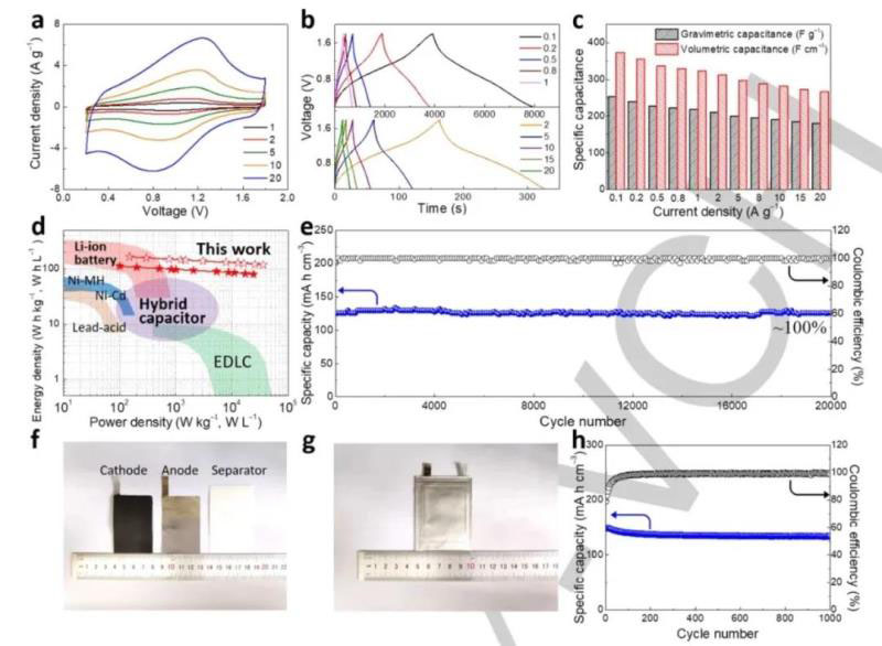 考慮到高理論容量(820 mAh g-1),低氧化還原電勢(-0.76 V),高安全性和低成本的特點,使用HOPC作電容性正極,鋅箔作電池型負(fù)極的鋅離子混合電容器(ZIC)具有良好的前景。由于HOPC在水性電解質(zhì)中的工作電位范圍較寬,因此,基于HOPC的ZIC可以在0.2?1.8 V的寬電壓范圍內(nèi)很好地工作(圖6a)。CV曲線上的寬氧化還原峰表明基于HOPC的ZIC是以法拉第贗電容反應(yīng)為主的電荷存儲機制?;贖OPC的ZIC的恒電流充/放電(GCD)曲線顯示出對稱和準(zhǔn)三角形的形狀,也證明了其贗電荷存儲機制(圖6b)。即使在20 A g-1的超高電流密度下,GCD曲線仍然保持對稱性,IR降很小,這再次反映出基于HOPC的ZIC的出色倍率性能。在0.1 A g-1下,其可提供378 F cm-3的高比電容(圖6c)。當(dāng)將電流密度提高到20 A g-1時,基于HOPC的ZIC仍可提供266 F cm-3的高比電容,且電容保持率達70%以上。