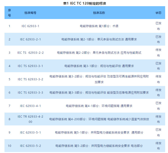 IEC在2012年成立了電能存儲系統(tǒng)技術委員會TC120,負責儲能系統(tǒng)接入電網(wǎng)相關標準的制定。該技術委員會成立了術語、單位參數(shù)和測試方法、規(guī)劃和安裝、環(huán)境問題、安全考慮5個工作組開展相關標準制定工作。目前制定和發(fā)布的標準見表1。
