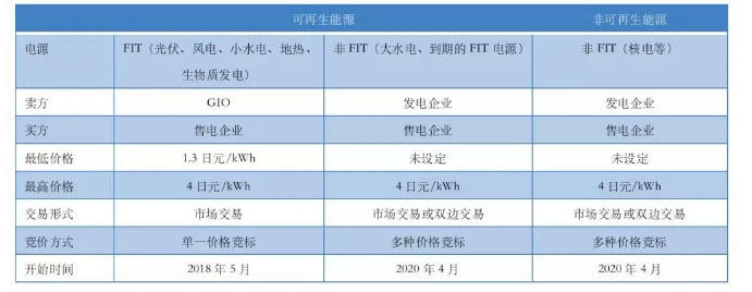 如表5所列,非化石價(jià)值證書(shū)分為可再生能源,非可再生能源兩大類(lèi),核電被劃定為非可再生能源類(lèi),其用途僅限于向政府主管部門(mén)申報(bào)碳排放核減之用??稍偕茉搭?lèi)又可分為FIT電力(可再生能源)和非FIT電力(包括大水電以及到期的FIT可再生能源)兩類(lèi)。因此,非化石價(jià)值證書(shū)總共三種:FIT非化石價(jià)值證書(shū)(可再生能源),非FIT非化石價(jià)值證書(shū)(可再生能源),非FIT非化石價(jià)值證書(shū)(非可再生能源)。其中FIT非化石價(jià)值證書(shū)從2018年5月起開(kāi)始交易,出售方為FIT資金管理機(jī)構(gòu)(低碳投資促進(jìn)機(jī)構(gòu),GIO),購(gòu)買(mǎi)方為售電企業(yè),F(xiàn)IT非化石證書(shū)競(jìng)拍最高限價(jià)為4日元/kWh,最低限價(jià)為1.3日元/kWh。原則上競(jìng)拍每季度舉行一次。非FIT非化石價(jià)值證書(shū)將從2020年4月開(kāi)始競(jìng)拍。政府希望通過(guò)市場(chǎng)交易回收部分可再生能源補(bǔ)貼費(fèi)用。