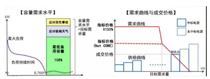 日本容量市場(chǎng)是集中式的容量市場(chǎng),容量需求和指標(biāo)價(jià)格由OCCTO確定。OCCTO根據(jù)2019年度的供電計(jì)劃,目前設(shè)定2024年容量需求為1.8億kW,如圖12(左)所示,容量需求的計(jì)算依據(jù)是:系統(tǒng)最低備用容量為H3的8%,應(yīng)對(duì)極端天氣的備用容量為H3的2%以及應(yīng)對(duì)惡性事故的備用容量為H3的1%。圖6(右)為反映容量?jī)r(jià)格與容量需求量關(guān)系的曲線,OCCTO以新建機(jī)組的投資回收年限設(shè)定指標(biāo)價(jià)格(Net CONE),現(xiàn)為9444日元/kW,競(jìng)標(biāo)上限價(jià)格不得超過(guò)指標(biāo)價(jià)格的150%。OCCTO以容量目標(biāo)水平為基礎(chǔ)設(shè)定需求曲線,以發(fā)電企業(yè)投標(biāo)容量形成供給曲線,以投標(biāo)價(jià)格與需求價(jià)格的相交點(diǎn)確定成交價(jià)格,當(dāng)?shù)陀谀繕?biāo)需求量時(shí)價(jià)格急速跳高,當(dāng)高于需求量時(shí)價(jià)格緩慢下落,所有交易成功的容量都將按這個(gè)價(jià)格支付費(fèi)用。
