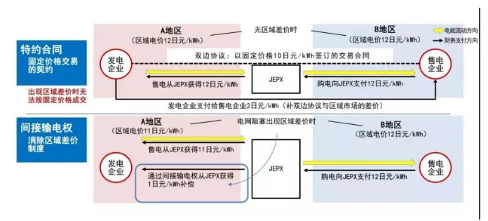 通常輸電權(quán)可以分為物理輸電權(quán)和金融輸電權(quán),分別表現(xiàn)為對(duì)于輸電容量的使用權(quán)和收益權(quán)。2019年4月,日本啟動(dòng)了間接輸電權(quán)交易市場(chǎng),其中輸電權(quán)是指物理跨區(qū)輸電容量的使用權(quán),輸電權(quán)所有者僅有自己獲得相關(guān)輸電服務(wù)的權(quán)力,不可以轉(zhuǎn)賣(mài),沒(méi)有收益權(quán)。間接輸電權(quán)一般是指當(dāng)電網(wǎng)發(fā)生阻塞時(shí),在現(xiàn)貨批發(fā)市場(chǎng)所約定的電能量范圍內(nèi),交易方有權(quán)要求JEPX支付區(qū)域市場(chǎng)差價(jià)的權(quán)利。因此,日本的間接輸電權(quán)可稱為“責(zé)任型”輸電權(quán),是分區(qū)電價(jià)結(jié)算差價(jià)的一種契約,而非歐美國(guó)家的權(quán)益型輸電權(quán)。