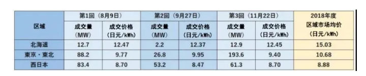 如表2所示,2020年日本交割的基荷電力分別于2019年8月、9月和11月進(jìn)行了競(jìng)價(jià)交易,分為北海道、東京?東北和西日本三個(gè)區(qū)域市場(chǎng)進(jìn)行。北海道地區(qū)價(jià)格達(dá)到12.37~12.47日元/kWh、東京?東北地區(qū)為9.40~9.95日元/kWh、西日本地區(qū)為8.47~8.70日元/kWh。而2018年度三區(qū)域現(xiàn)貨平均價(jià)格分別為北海道15.03日元/kWh、東京?東北10.68日元/kWh、西日本8.88日元/kWh。從交易價(jià)格來(lái)看,基荷電力市場(chǎng)價(jià)格盡管低于現(xiàn)貨市場(chǎng)價(jià)格1-2日元/kWh,但實(shí)際上與新增電力公司同大電力公司簽訂的中長(zhǎng)期雙邊協(xié)議價(jià)格相差無(wú)幾,基荷市場(chǎng)并未突顯現(xiàn)出價(jià)格優(yōu)勢(shì)。從交易量來(lái)看,北海道市場(chǎng)為27.8MW、東京?東北市場(chǎng)308.6MW、西日本市場(chǎng)為197.9MW,三個(gè)市場(chǎng)成交電量為534.3MW,相當(dāng)于46.8億kWh/年,僅占新增電力公司2018年度全部售電量(1229億kWh)的3.8%。因此,新增電力公司更傾向通過(guò)中長(zhǎng)期協(xié)議獲得大電力公司的備用電源,或者通過(guò)資本紐帶依附于大電力公司抵御風(fēng)險(xiǎn)。