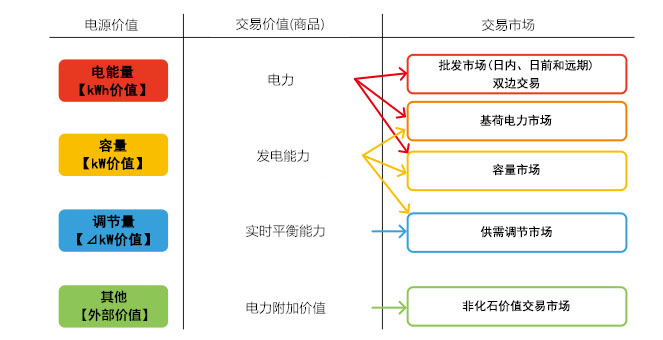 2017年2月,日本提出新電力市場(chǎng)建設(shè)方案,如圖4所示,新電力市場(chǎng)設(shè)計(jì)理念改變了傳統(tǒng)電力市場(chǎng)統(tǒng)一以kWh體現(xiàn)價(jià)值的體系,明確將電力價(jià)值區(qū)分為kW價(jià)值(容量?jī)r(jià)值)、kWh價(jià)值(度電價(jià)值)和⊿kW價(jià)值(平衡服務(wù)價(jià)值),并分別設(shè)計(jì)了與體現(xiàn)這些價(jià)值相對(duì)應(yīng)的新電力市場(chǎng)規(guī)劃,2017年2月,經(jīng)過(guò)反復(fù)論證,政府完成了相關(guān)市場(chǎng)的整體架構(gòu)設(shè)計(jì)。與此同時(shí)陸續(xù)開(kāi)啟了非化石價(jià)值交易市場(chǎng)(2018年5月)、間接輸電權(quán)市場(chǎng)(2019年4月)、基荷電力市場(chǎng)(2019年8月)、容量市場(chǎng)(2020年7月)、供需調(diào)節(jié)市場(chǎng)(2021年4月),向統(tǒng)一大電力市場(chǎng)的建設(shè)目標(biāo)進(jìn)一步邁進(jìn)。