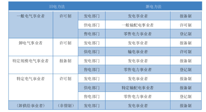 2016年4月,日本根據(jù)新修訂的電氣事業(yè)法(電力法),取消了按經(jīng)營(yíng)規(guī)模的縱向分類(lèi)法。如表1所示,新電力法將舊電力企業(yè)橫向分解為發(fā)電(報(bào)備制)、輸配電(許可制)、售電(登記制)三大類(lèi)企業(yè),其中輸配電企業(yè)仍沿用過(guò)去分類(lèi),細(xì)分為3類(lèi):第1類(lèi)“一般送配電事業(yè)者”是由原來(lái)十大電力公司的輸配電部門(mén)脫鉤成立新的電網(wǎng)企業(yè)(共10家,實(shí)行許可制);第2類(lèi)“輸電事業(yè)者”是由原來(lái)“卸電氣事業(yè)者”的輸電部門(mén)獨(dú)立出來(lái)成立新的配電企業(yè)(現(xiàn)有3家,實(shí)行許可制);第3類(lèi)“特定送配電事業(yè)者”則由原來(lái)“特定電氣事業(yè)者”的輸配電部門(mén)脫鉤成立輸配電企業(yè)(現(xiàn)有32家,實(shí)行報(bào)備制)。因此,重新分類(lèi)后的電力企業(yè)共有5類(lèi)牌照:“發(fā)電事業(yè)者”、“一般送配電事業(yè)者”、“送電事業(yè)者”、“特定送配電事業(yè)者”、“零售電氣事業(yè)者”等。十大電力公司從此被陸續(xù)分拆為發(fā)電、輸配電、售電三類(lèi)企業(yè)。