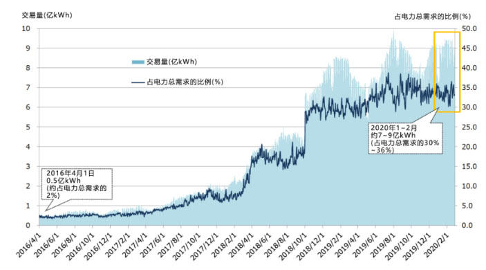2003年11月,日本在第三輪電改中就設(shè)立了發(fā)、售電企業(yè)交易的電力批發(fā)市場(chǎng)(JEPX),但仍以中長(zhǎng)期合約雙邊交易為主。經(jīng)過(guò)多年培育,現(xiàn)已形成以日前市場(chǎng)為主,包括日內(nèi)市場(chǎng)、遠(yuǎn)期市場(chǎng)以及場(chǎng)外公告牌市場(chǎng)的電力交易體系。從2012年到2018年,日本交易所電能量交易年均增長(zhǎng)73.9%,占全社會(huì)用電量比重,由2016年4月的0.5%快速增長(zhǎng)至2019年12月的39.5%,一改中長(zhǎng)期合約一統(tǒng)天下的局面。