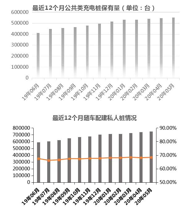 截至2020年5月,整車企業(yè)采樣約109.50萬輛車的車樁相隨信息,其中建設安裝私人類充電樁74.88萬臺,未配建私人樁數量34.61萬臺,隨車配建私人樁比例為68.39%。