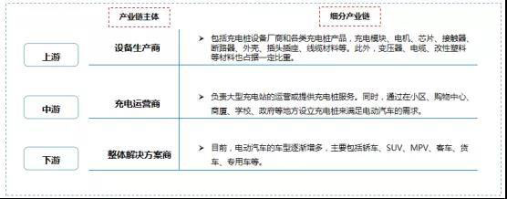 充電樁市場產業(yè)鏈的主體以充電樁設備生產商、充電運營商、新能源汽車為代表,這三個主體分別位于產業(yè)鏈上游、中游和下游,在整個市場中扮演著重要的角色,經常相互重合。